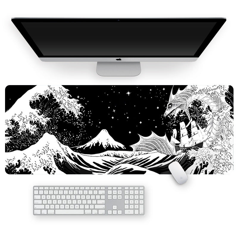 Turn your setup into a masterpiece. This premium desk mat blends art and function, featuring a breathtaking black-and-white design inspired by The Great Wave — reimagined with a fierce sea dragon and starry night sky.